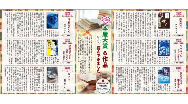 2025本屋大賞6作品じっくり読んでみました 2025年11月6日2025年11月6日 特集 2025本屋大賞6作品じっくり読んでみました 画像クリックで拡大表示します。 息苦しいほどの夏の暑さはどこへやら。 すっかり涼しくなった夜風が 心地良い を飛び越えて、肌寒さすら感じる今日この頃。 もうすぐやってくる冬の始まりも見え隠れしてきましたね。 そんな束の間の秋の夜長に、ゆったりのんびり読書はいかが? でも、何から読めばいいのかな…? と、本選びに困ったら、全国の本屋さんが選んだこちらをどうぞ!