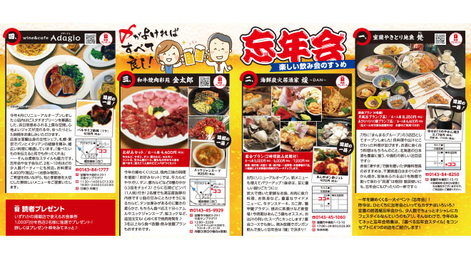 2025〆がよければすべて良し 忘年会楽しい飲み会のすゝめ 2025年11月20日2025年11月14日 特集 2025忘年会楽しい飲み会のすゝめ 画像クリックで拡大表示します。 一年を締めくくる一大イベント「忘年会」! 昨今は、ひとくちに忘年会といってもカタチはいろいろ♪ 定番の居酒屋忘年会から、少人数でちょっとオシャレにカフェスタイルなんていうのもアリ。そんなわけで、今年のみてネッと忘年会特集は、「選べる忘年会スタイル」をコンセプトに4つのお店をご紹介します!