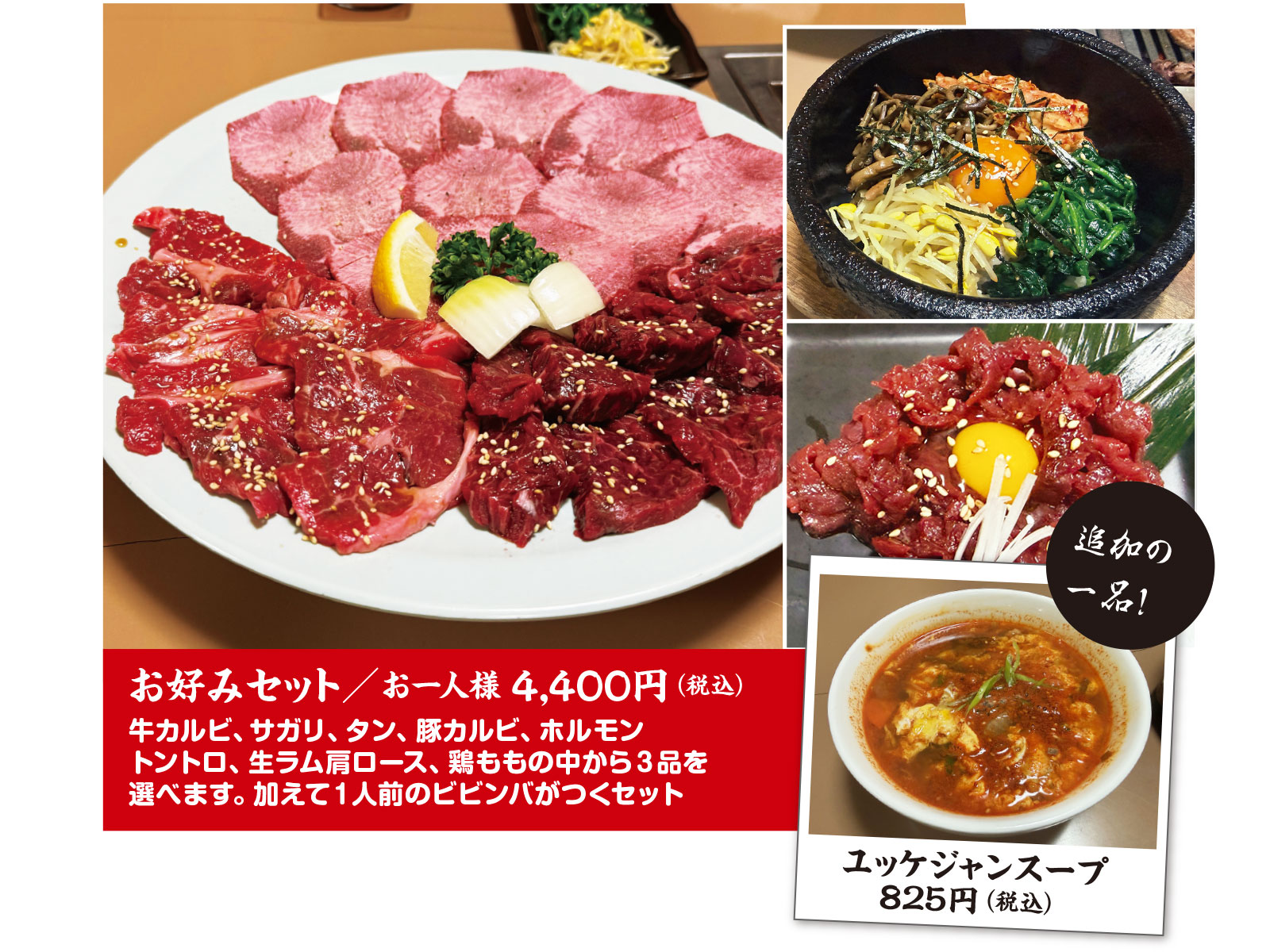 今年の締めくくりには、焼肉三昧の時間を堪能!『お好みセット』では、牛カルビやサガリ、タン、豚カルビなど8種の中から3品をチョイス!さらに石焼ビビンバ(1人前)付き!2名様でも満足度抜群の内容です☆脂の甘みにとろけそうになるカルビ、タンは厚みがあるのに驚きの柔らかさ、もちろん食べ応え十分☆ナムルやユッケジャンスープ、桜ユッケなど、追加注文も!心ゆくまで焼肉時間を♪