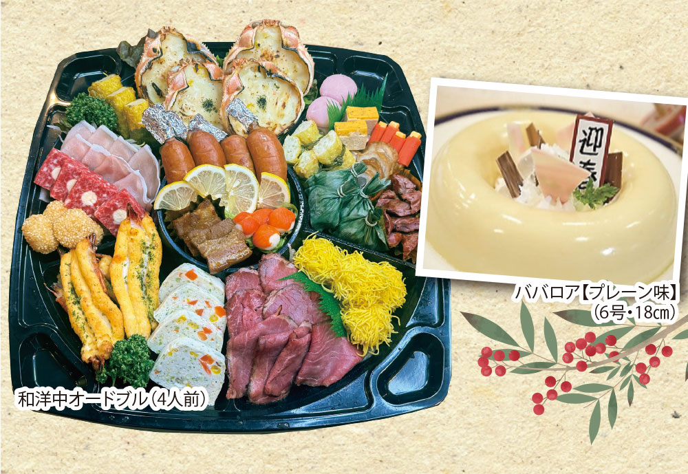 年末には、豪華な和洋中オードブル!4人前で19種類もの豊富なメニューがラインナップ!色とりどりの料理が盛り付けられ、食べ応えも十分。年齢を問わず楽しめます♪また、毎年人気の「特製ババロア」もオススメの一品!プレーン味の6号(18㎝)サイズ。その美味しさに、みんなでニッコリ♪10,000円以上のご注文で室蘭・登別・伊達に配達してくれるお得なサービスもあり。詳細は、パンフレットまたはホテルにお問い合わせを!