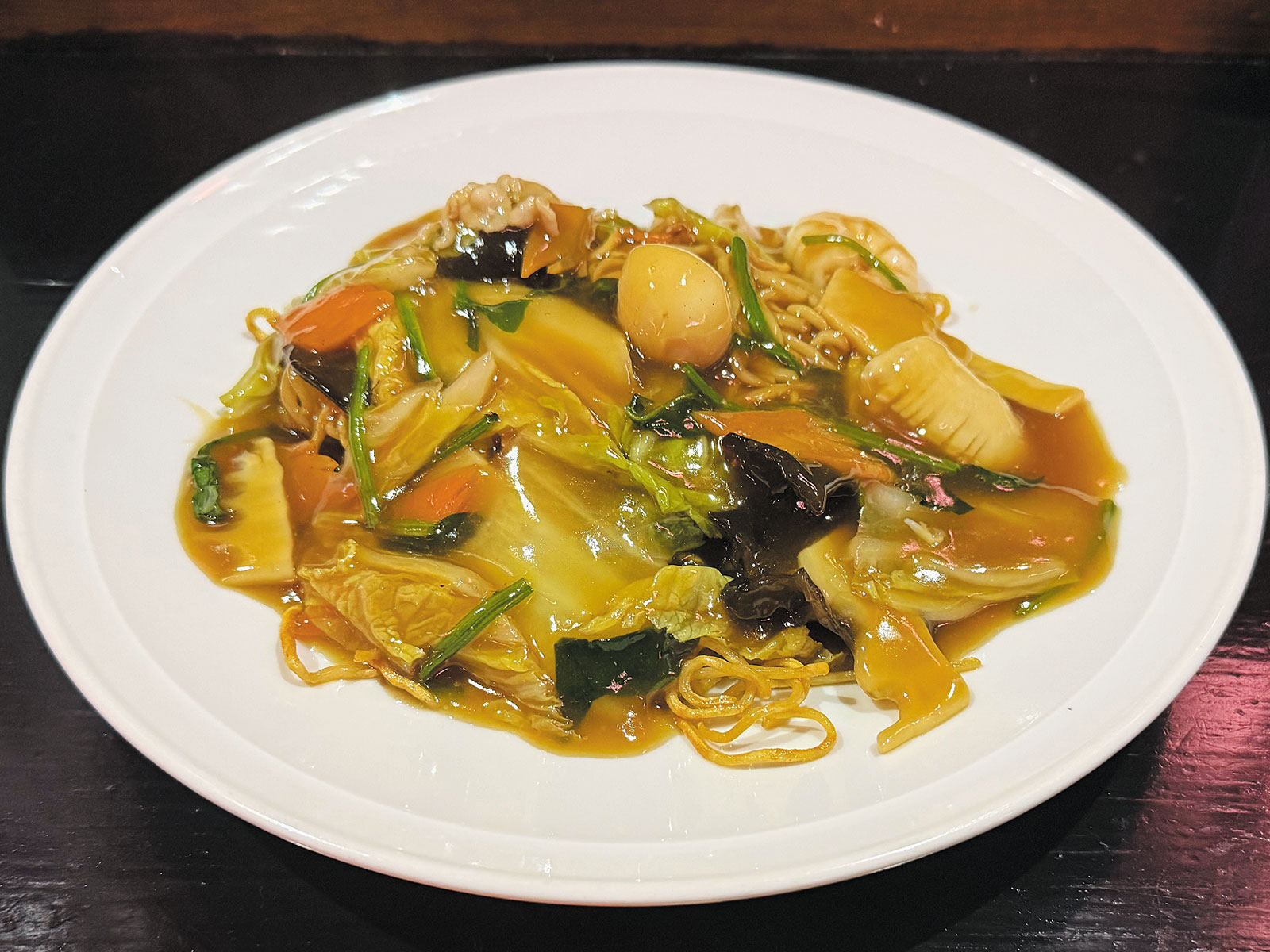 カラダが温まる「あんかけ」メニュー☆寒い日には、彩り豊かな、五目あんかけやきそばはいかが?とろりとしたあんが麺にたっぷり絡み、ハフハフと食べ進めると、体の内側からじんわり温まります♪具材の旨みが溶け込んだあんは、野菜がたっぷり入って、醤油ベースのあっさり目。香ばしく焼かれた麺との相性も抜群!野菜やきくらげの食感を楽しみながら、最後まで満足感が続きます。寒い季節につい足を運びたくなる、カラダ温まるひと皿です!